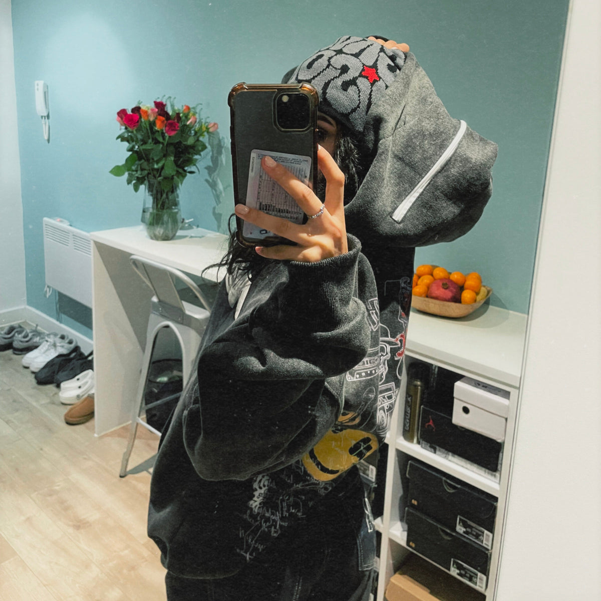 This hoodie features an oversized fit, so we recommend choosing your usual size for the intended look. For the best fit, refer to the size chart